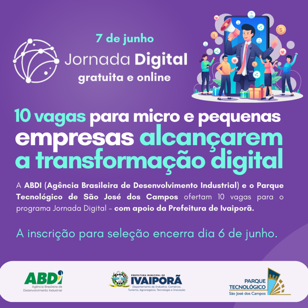 A ABDI (Agência Brasileira de Desenvolvimento Industrial) e o Parque Tecnológico de São José dos Campos ofertam 10 vagas para a Jornada Digital – com apoio da Prefeitura de Ivaiporã. A Jornada Digital é gratuita e acontecerá no dia 7 de junho. Quanto à inscrição, que encerrará dia 6 de junho, deve ser feita pelo link https://forms.gle/dx6BKaU9pwjXp2jx7