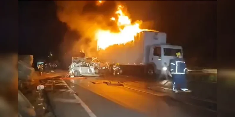 Conforme apuração preliminar, são três carros e dois caminhões acidentados. A vítima fatal morreu carbonizada. Ela estava em um dos carros envolvidos no acidente.
