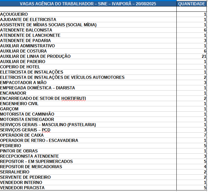 Nesta quinta-feira (21), a Agência do Trabalhador de Ivaiporã anunciou a disponibilidade de vagas de emprego em diversas áreas e para diferentes níveis de escolaridade. As oportunidades são oferecidas por meio do Sistema Nacional de Emprego (Sine) e estão abertas para candidatos interessados em ingressar ou retornar ao mercado de trabalho.
