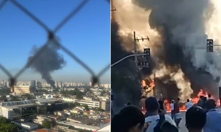 Na queda, a aeronave atingiu um ônibus, que ficou em chamas.