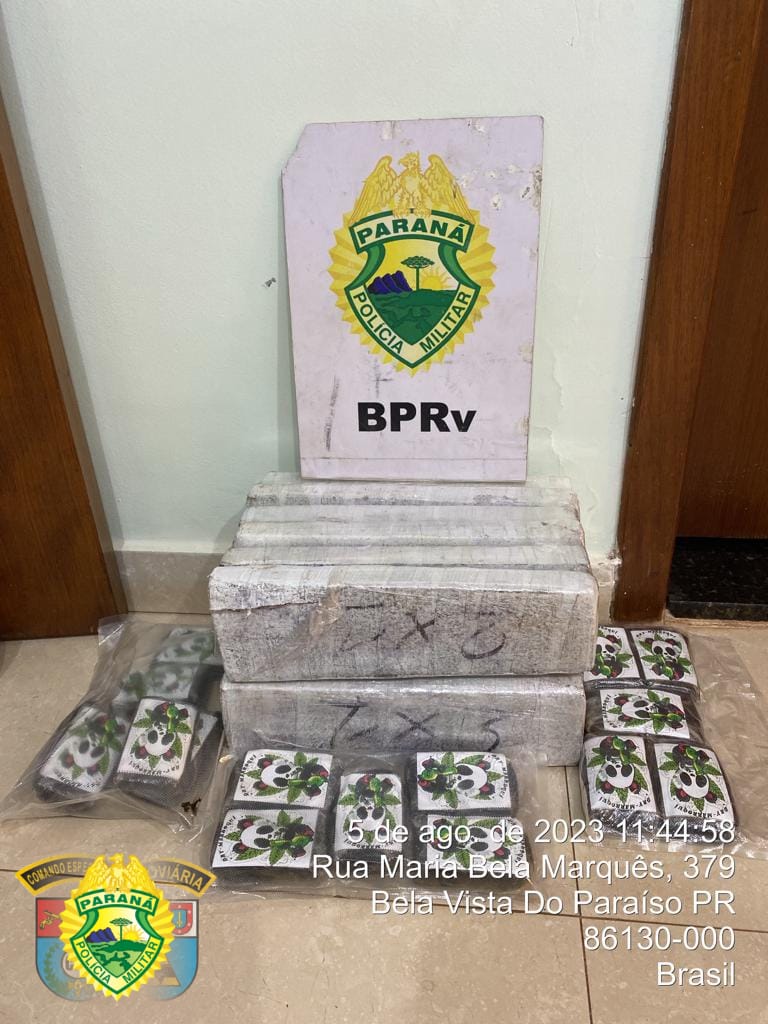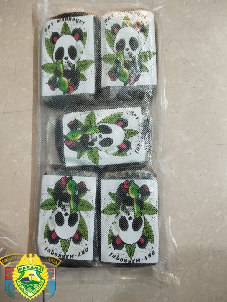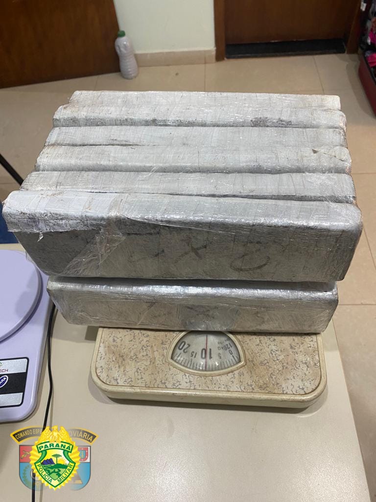 10h30min deste sábado, 05 de agosto, na PR 323 em frente ao Posto Rodoviário de Charles Naufal, a equipe de serviço, em abordagem a um ônibus interestadual, logrou êxito em localizar uma bagagem pertencente a uma passageira menor de idade, a qual continha 12 tabletes de substância análoga a maconha pesando aproximadamente 10kg e 05 embalagens de haxixe “Dry Marroquino” pesando aproximadamente 02 kg da substância entorpecente.