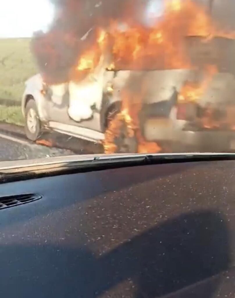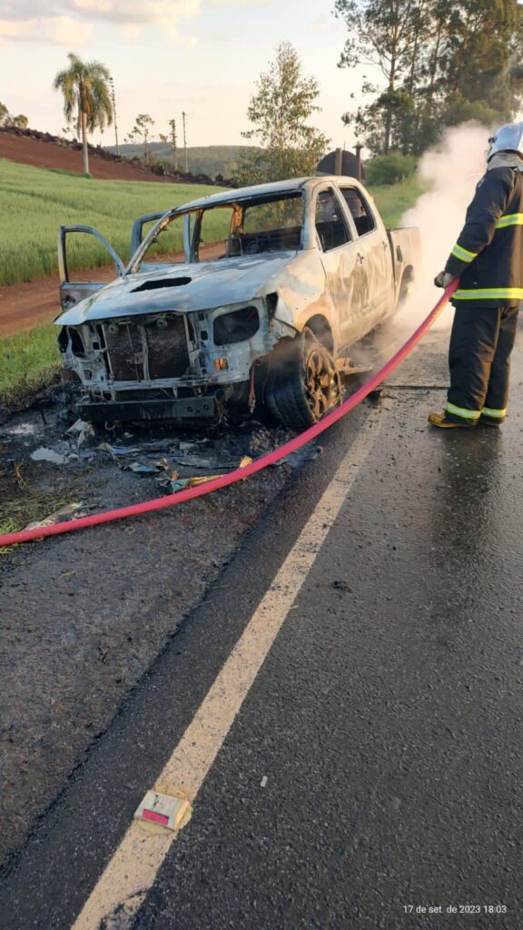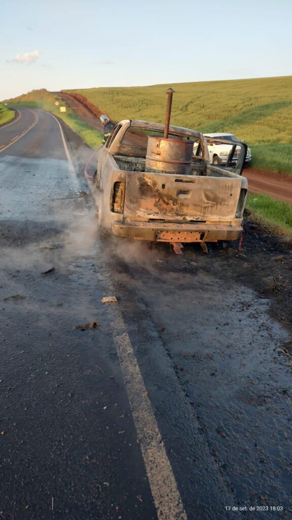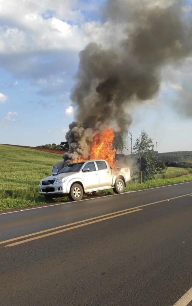 Uma camionete Toyota Hilux pegou fogo na Rodovia PR-466, km151, entre Ivaiporã e Manoel Ribas, no Paraná, por volta de 17h35, da tarde deste domingo (17).
