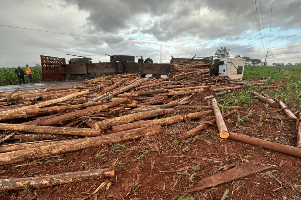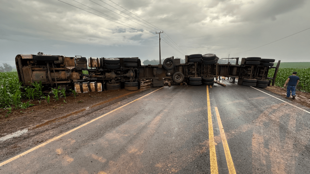 Uma carreta carregada com tora de pinus tombou na manhã desta quarta-feira (3) na PR-082, em São João do Ivaí.