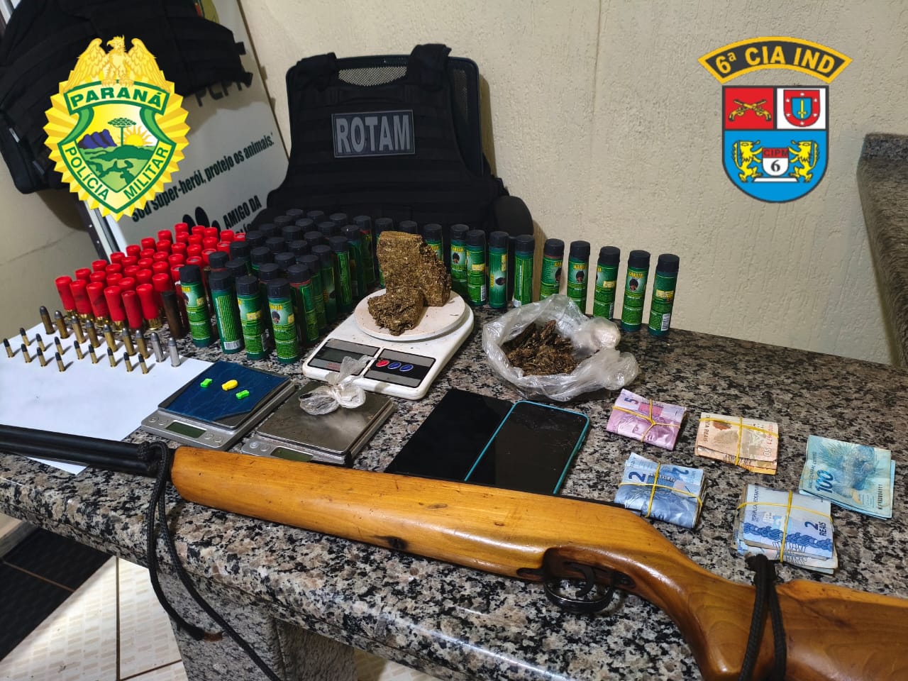Na residência utilizada pelo casal, a ROTAM encontrou um verdadeiro arsenal e grande quantidade de entorpecentes e materiais para a traficância: