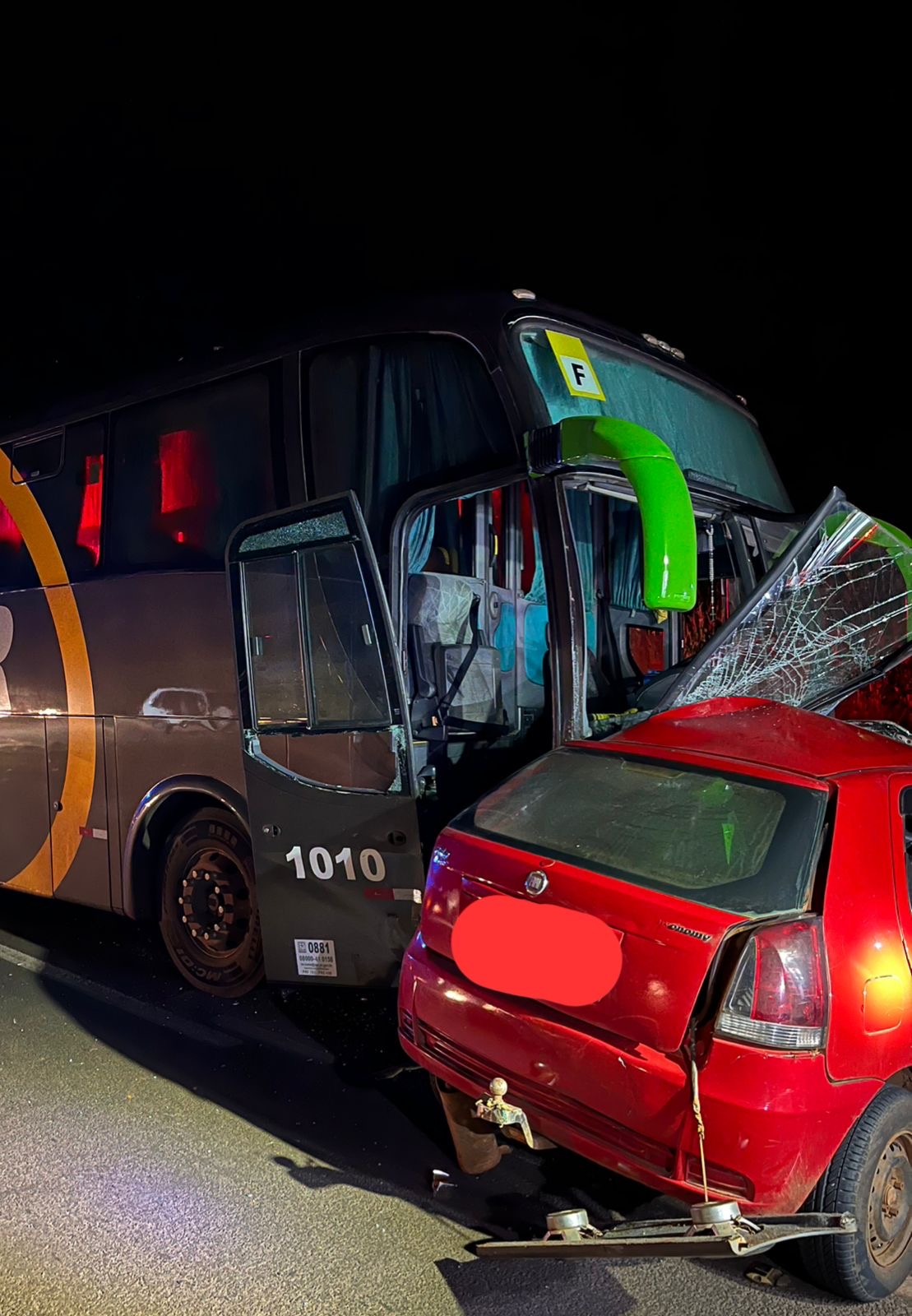 A central do Corpo de Bombeiros foi acionada para atender a uma colisão entre um automóvel (um Palio vermelho) e um ônibus, com a informação inicial de duas vítimas com possível encarceramento.