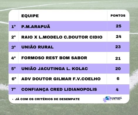 O primeiro confronto, marcado para iniciar as 15 horas será da Prefeitura Municipal do Arapuã contra a equipe do Formoso Restaurante Bom Sabor. O segundo jogo da semi finais será entres as equipes Raio X, Laboratório Modelo e Cons. Dr. Cídio contra o União Rural as 17 horas.