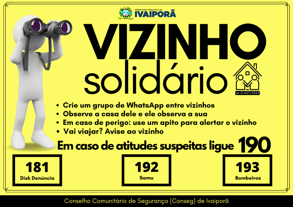 O Conselho Comunitário de Segurança (Conseg) e lançando o programa Vizinho Solidário, nesta sexta-feira, dia 24 de fevereiro, com apoio do Departamento de Assistência Social, Conselho Municipal dos Direitos da Criança e do Adolescente, Conselho Municipal dos Direitos do Idoso, Conselho Municipal de Políticas Públicas sobre Drogas, Rotary Club, Associação de Senhoras de Rotarianos de Ivaiporã, e da Polícia Militar. A ação foi conduzida pelo presidente do Conseg, Jair Burato.
