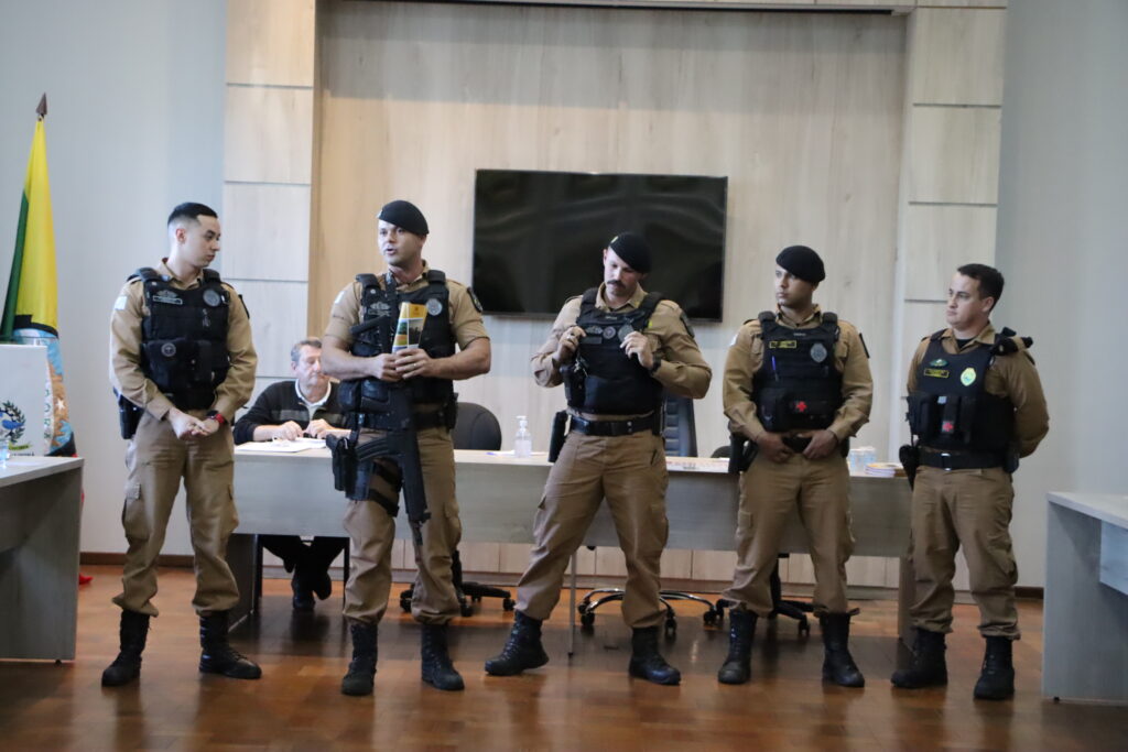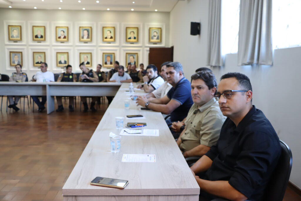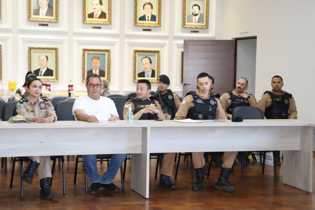 O Conselho Comunitário de Segurança (Conseg) e representantes da Polícia Militar, Polícia Civil, Departamento de Polícia Penal do Estado do Paraná (Deppen), Polícia Científica e do 1º Subgrupamento de Bombeiros Independente se reuniram no salão nobre da Prefeitura com o prefeito Carlos Gil para debater a segurança pública.