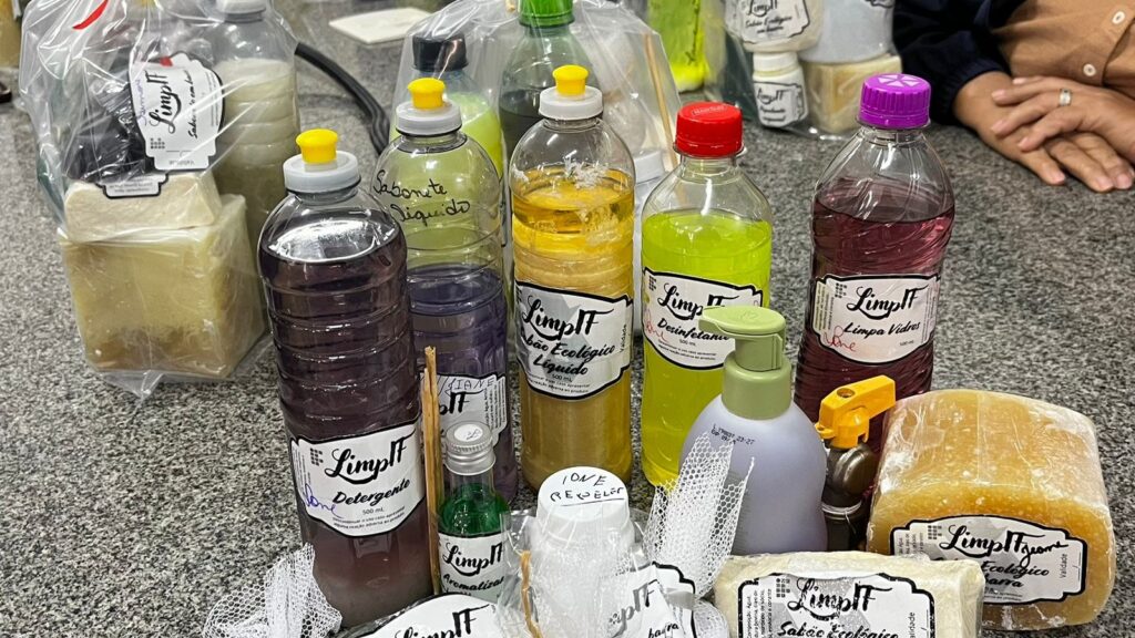 Durante o curso, foram reutilizados cerca de 10 litros de óleo de cozinha, embalagens de leite, garrafas PET, frascos de remédios e outros materiais recicláveis, reforçando a prática da educação ambiental e da química verde.