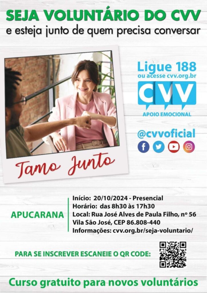O Núcleo de Apoio à Vida de Apucarana (Naviap) está com inscrições abertas para nova turma de voluntários para atuar no Centro de Apoio à Vida (CVV). O Programa de Seleção de Voluntário (PSV) terá início no dia 20 de outubro. Os interessados precisam ter mais de 18 anos e passar pelo treinamento conduzido por voluntários do CVV.
