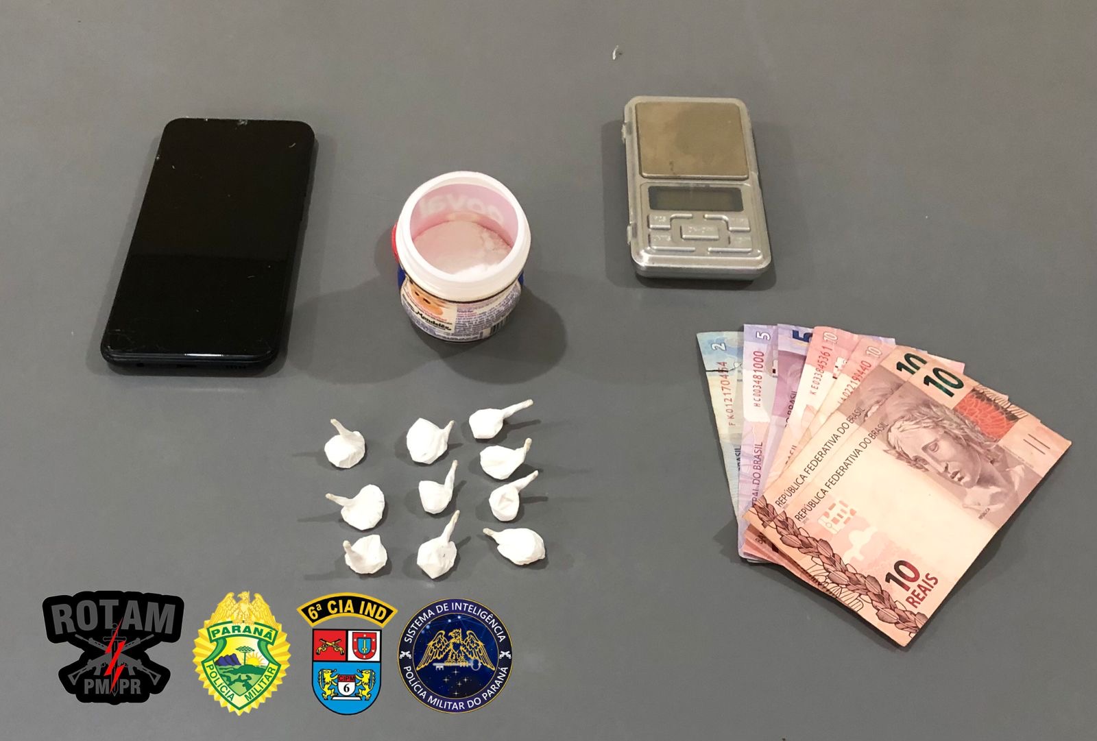 No entanto, dentro da casa foram encontradas outras porções de cocaína totalizando 6,4 gramas, além de uma balança de precisão, R$ 50,00 em dinheiro e um pote de “Royal”, que não foi possível confirmar se era fermento em pó ou cocaína.