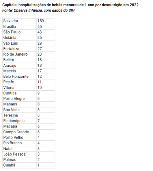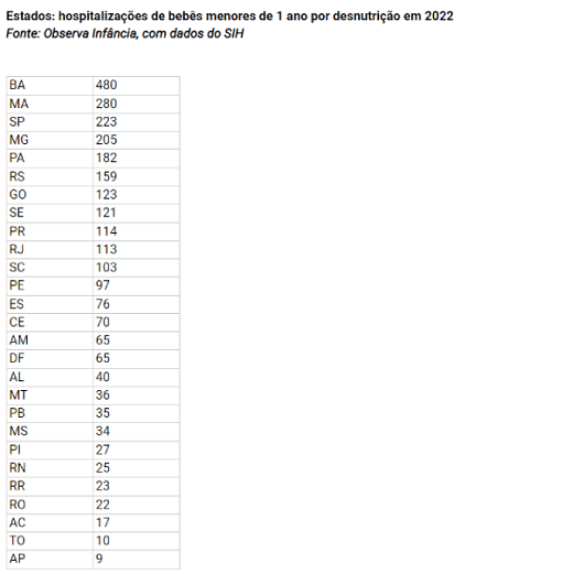 No total, o Sistema Único de Saúde (SUS) registrou 2.754 internações de bebês menores de 1 ano por desnutrição, sequelas da desnutrição e deficiências nutricionais – o equivalente a sete por dia em todo o país. Das regiões do Brasil, o Nordeste concentrou o maior número de hospitalizações, com 1.175, enquanto o Sul registrou 376 bebês internados.