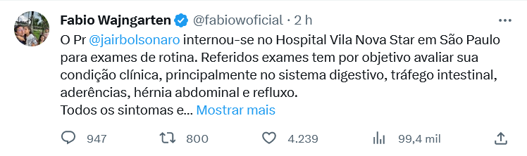 Conforme a publicação feita no Twitter, Bolsonaro irá passar por alguns exames de rotina para avaliar a condição clínica do sistema digestivo. Ele foi atendido e está sob os cuidados do médico pessoal dele.