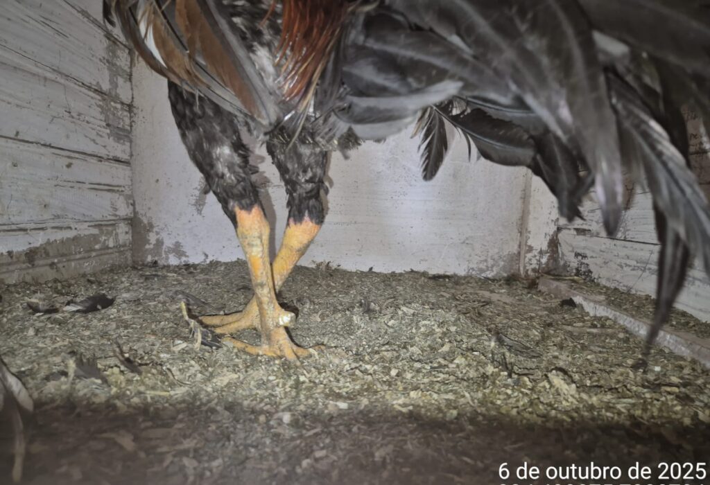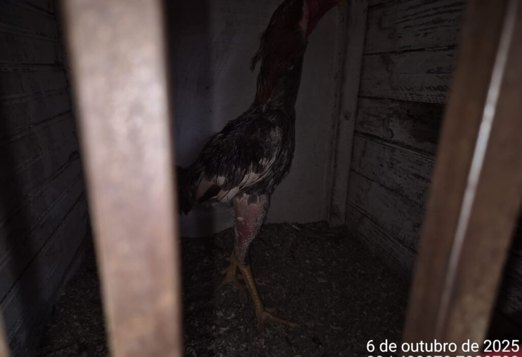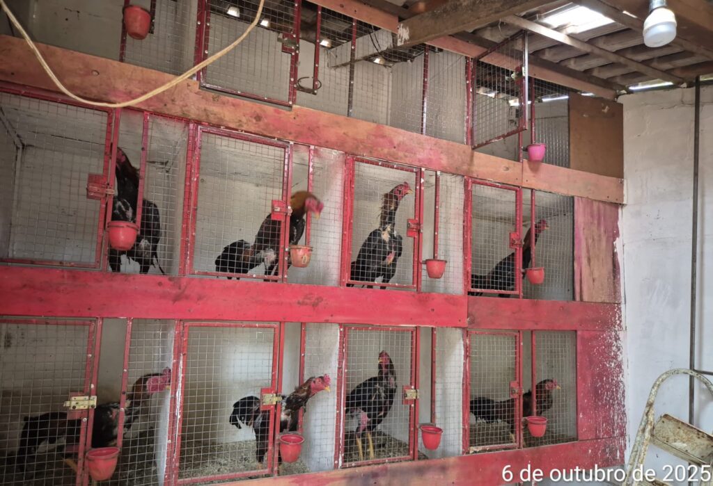A operação identificou a prática de maus-tratos a animais e resultou na apreensão de 24 galos adultos da raça Mura (galo-índio). As aves estavam sendo mantidas em compartimentos isolados e suspensos.