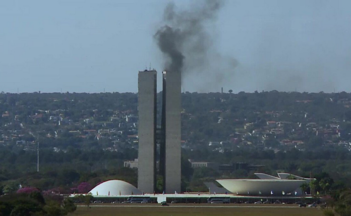 Uma grande quantidade de fumaça escura foi vista no Congresso Nacional, em Brasília, nesta sexta-feira (21). Em imagens é possível ver a fumaça na torre que fica localizada mais próxima da Câmara dos Deputados.