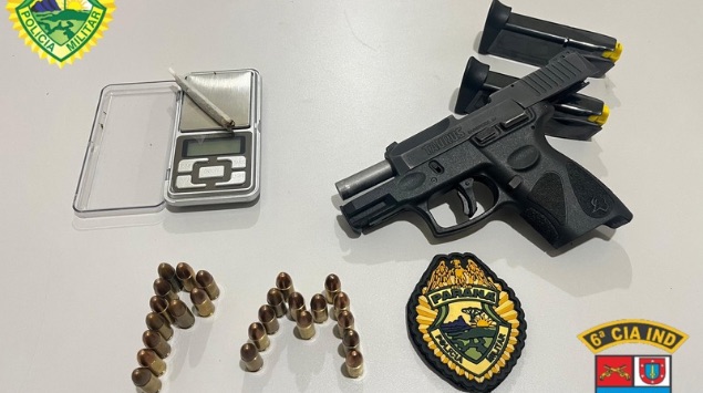 Durante patrulhamento pela região, a equipe RPA abordou o suspeito e, em busca pessoal, encontrou uma pistola Taurus calibre .9mm com 24 munições intactas e um cigarro de maconha. Diante dos fatos, o homem foi preso em flagrante e conduzido à delegacia de polícia.