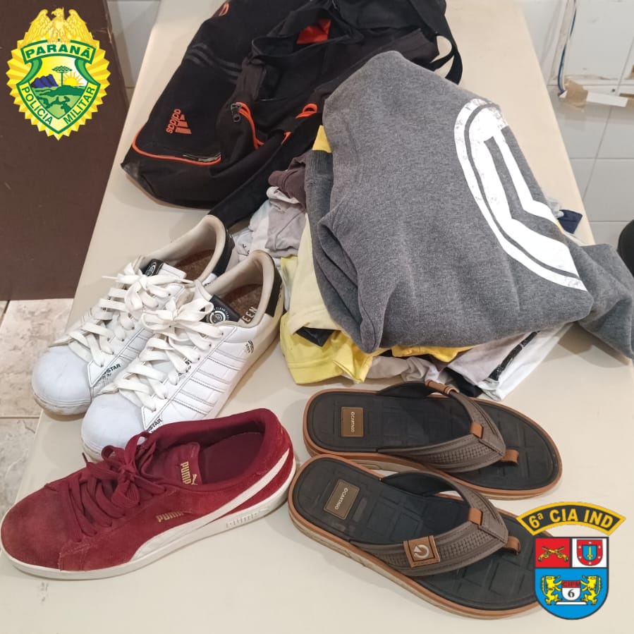A equipe da Rondas Ostensivas de Polícia (RPA) de Ivaiporã realizava patrulhamento pela região quando avistou um homem em atitude suspeita. Ao abordá-lo, os policiais encontraram diversas roupas e pares de tênis em seu poder.