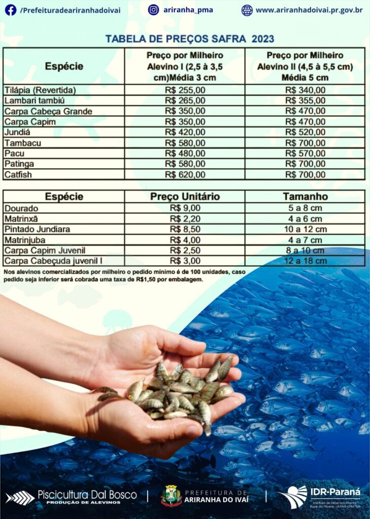 Com o objetivo de incentivar a prática da piscicultura nas propriedades rurais de Ariranha do Ivaí, a Administração Municipal por meio da Secretaria Municipal de Agricultura e o Instituto de Desenvolvimento Rural (IDR), informa que a partir desta terça-feira, 07 de março, foram iniciadas as encomendas de alevinos. Os pedidos estão sendo realizados no IDR, antiga EMATER, e podem ser feitos até o dia 06 de abril.