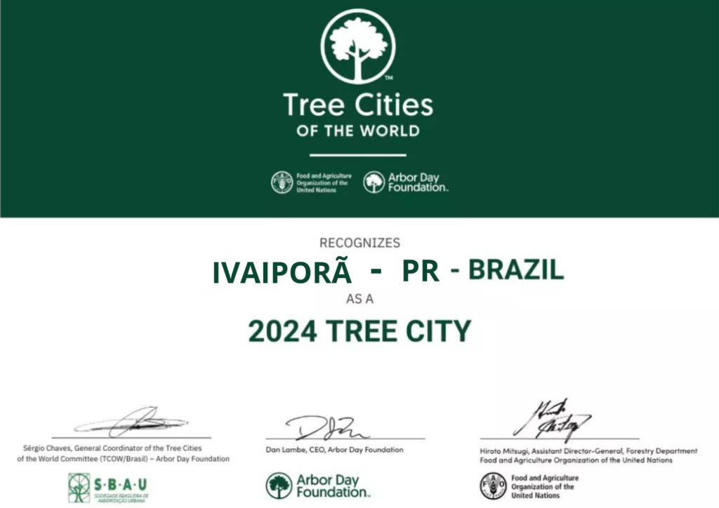 Ivaiporã recebeu uma importante certificação ambiental. Pela 3ª vez consecutiva é reconhecida como Cidade Árvore do Mundo pelo programa internacional Tree Cities of The World – uma iniciativa da Arbor Day Foundation e da Organização das Nações Unidas para Alimentação e Agricultura (FAO/ONU).