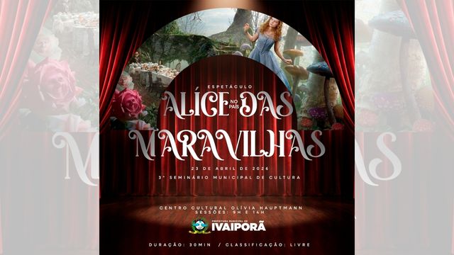 Como parte da programação do 3º Seminário Municipal de Cultura, a Prefeitura de Ivaiporã promove, no dia 23 de abril de 2026, o espetáculo “Alice no País das Maravilhas”. As apresentações ocorrerão no Centro Cultural Olívia Hauptmann em duas sessões: às 09h e às 14h. Com duração de 30 minutos e classificação livre, o evento é uma excelente oportunidade para prestigiar a cultura local com toda a família.