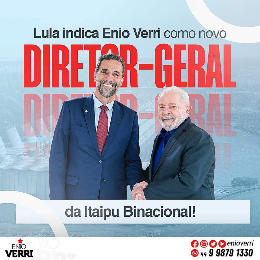 O Presidente da República Luis Inácio Lula da Silva (PT) indicou nesta quinta-feira (26), o deputado federal Ênio Verri (PT) para o cargo de diretor-geral da Itaipu. Verri se reuniu hoje por volta de 15h com o presidente Lula e a presidente nacional do PT, deputada federal Gleisi Hoffmann, onde foi confirmada a indicação.