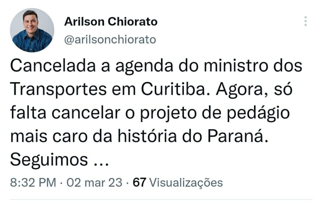 No início da noite, Chiorato publicou a informação sobre o cancelamento da agenda em clima de comemoração. “Cancelada a agenda do ministro dos Transportes em Curitiba. Agora, só falta cancelar o projeto de pedágio mais caro da história do Paraná”, escreveu.