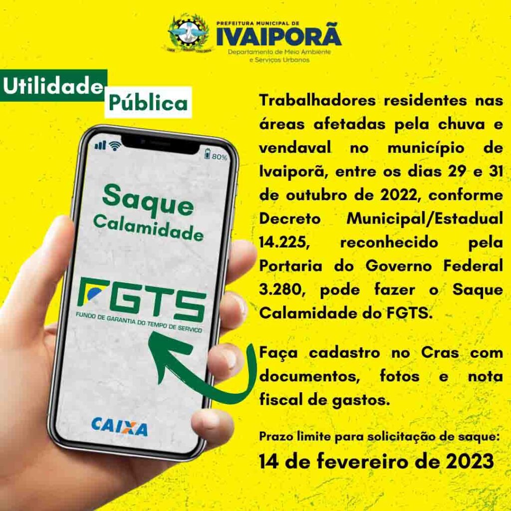 Moradores de Ivaiporã de áreas afetadas pela chuva e vendaval, entre os dias 29 e 31 de outubro em 2022, podem solicitar Saque Calamidade do Fundo de Garantia do Tempo de Serviço (FGTS) até 14 de fevereiro.