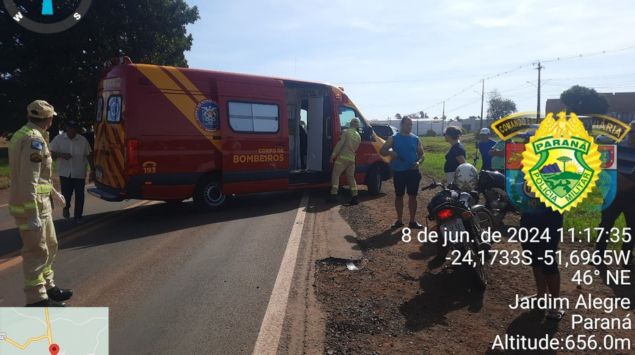 Um motociclista identificado pelas iniciais N. M. de 57 anos sofreu ferimentos leves em um acidente na PR-466, em Jardim Alegre, na manhã deste sábado (08). A ocorrência foi registrada por volta das 10h10, no km 100+300 da rodovia.