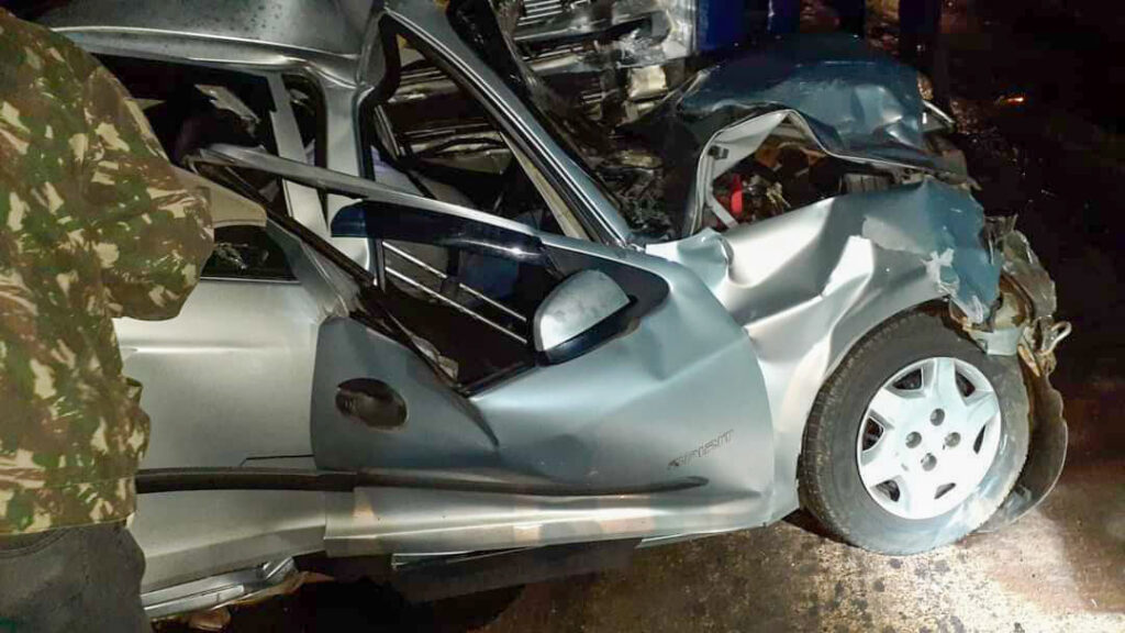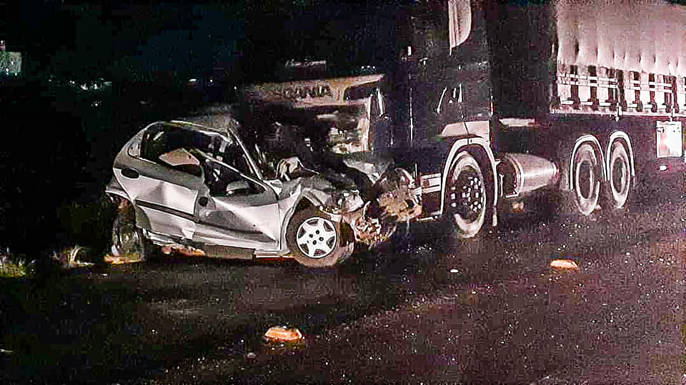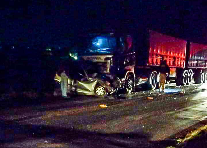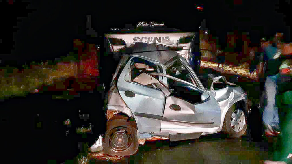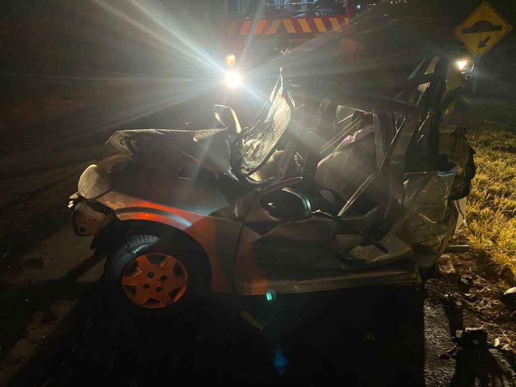 O condutor do Celta também perdeu o controle do carro, cruzou a pista e bateu de frente com a Scania R 420, placa de Irati (Centro) – que tinha dois semirreboques Guerra acoplados, e vinha na direção contrária.