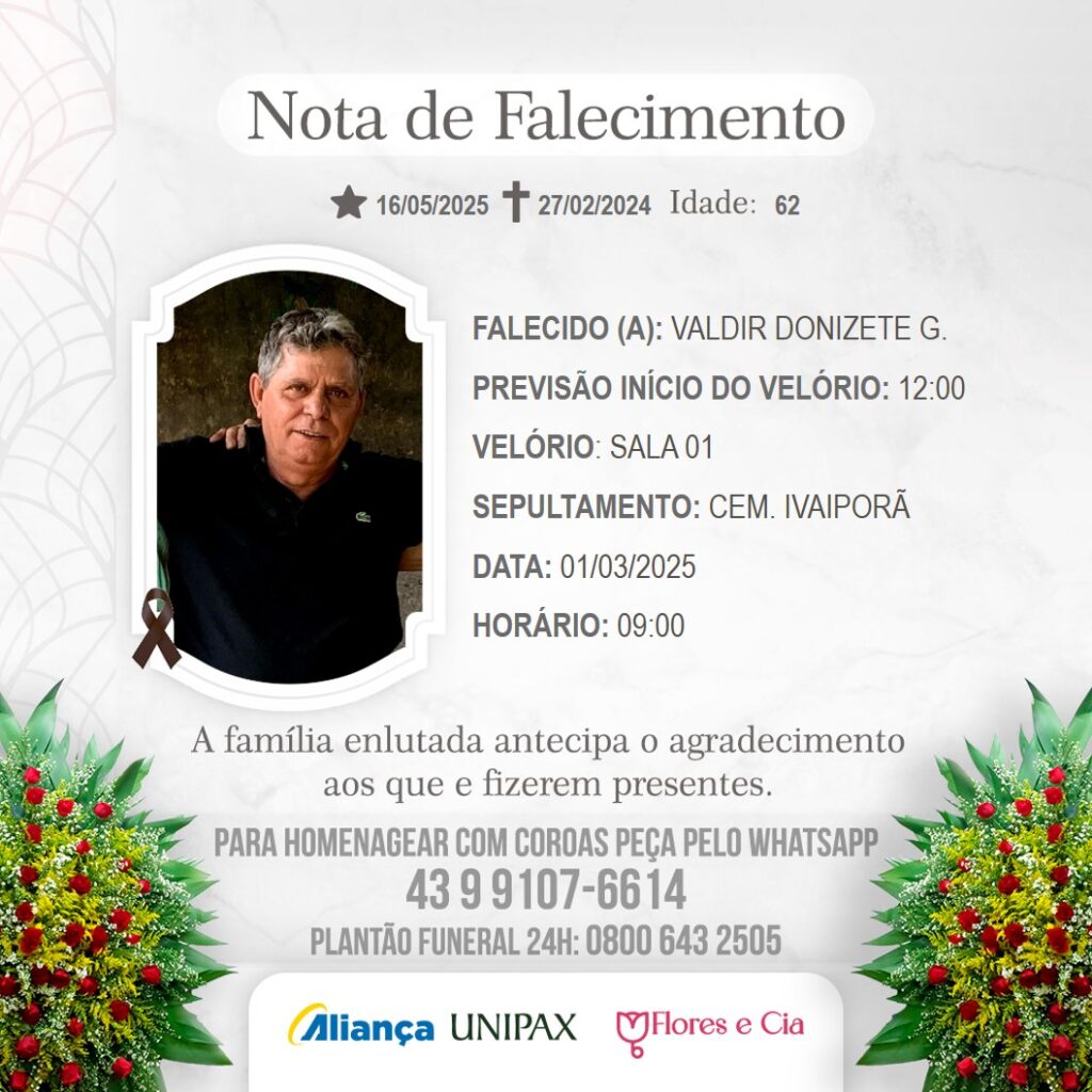 O velório terá início às 12h00 na Sala 01. O sepultamento será realizado neste sábado (01/03), às 09h00, no Cemitério de Ivaiporã.