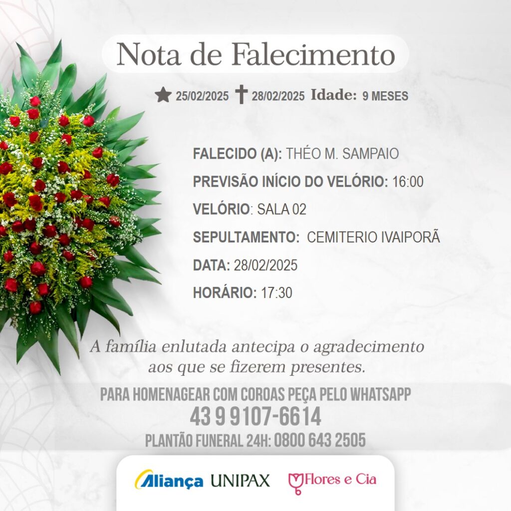 Comunicamos com profundo pesar o falecimento do pequeno Théo M. Sampaio, ocorrido nesta sexta-feira (28/02), aos 9 meses de gestação. Nascido em 25 de fevereiro de 2025, Théo deixa um vazio imenso no coração de seus pais, familiares e amigos.