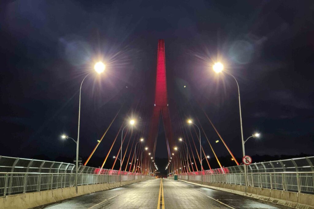 Nesta semana, com o teste da iluminação cênica da ponte, foram concluídos os últimos trabalhos na estrutura que fica entre Foz do Iguaçu, no Oeste do Paraná, e o município paraguaio de Presidente Franco. A última etapa contemplou a instalação de projetores com cerca de 19 mil pixels em RGB nos estais da ponte, além de projetores lineares nos pilares e mastros.