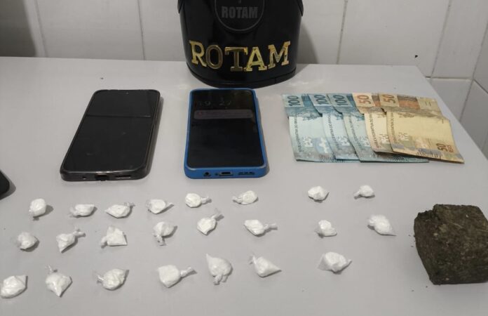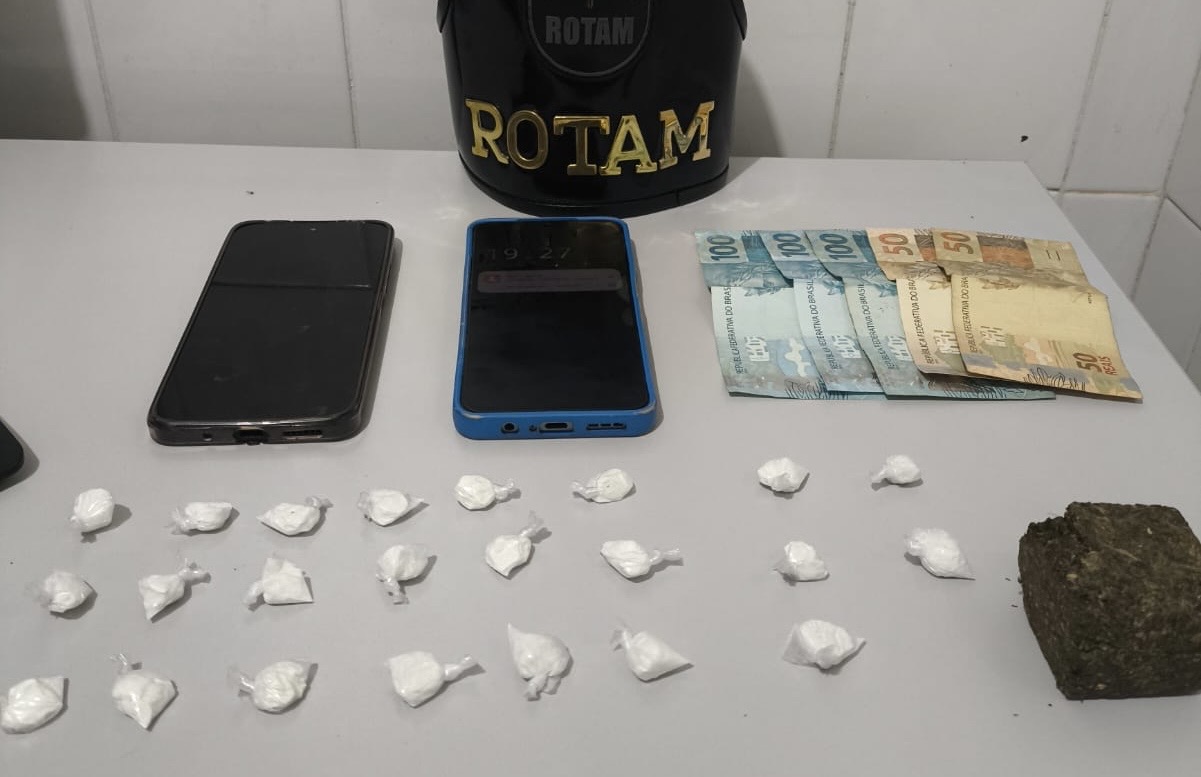 Na sequência, a diligência prosseguiu até a residência da mulher, onde foram localizadas mais porções de cocaína já embaladas para a venda, uma porção de maconha e R$ 400,00 em dinheiro trocado.