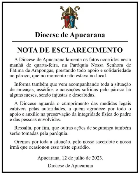 Na nota, a Diocese lamentou o ocorrido, disse que “vem acompanhando a situação de ameaças, assédios e acusações sofridas pelo pároco há alguns meses” e que “outras ações de segurança serão tomadas pela paróquia”.