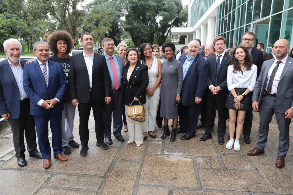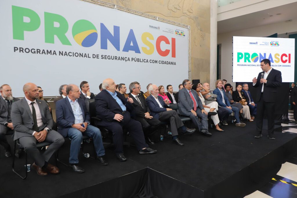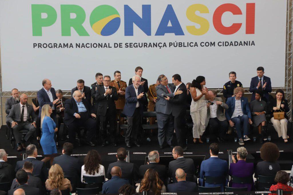 PRESENÇAS — Participaram da solenidade o vice-governador Darci Piana; o presidente do Tribunal de Justiça do Paraná, Luiz Fernando Tomasi Keppen; os chefes da Casa Civil, João Carlos Ortega, e da Casa Militar, tenente-coronel Sérgio Vieira; os secretários estaduais da Justiça e Cidadania, Santin Roveda; da Mulher e Igualdade Racial, Leandre Dal Ponte; da Comunicação, Cleber Mata; do Planejamento, Guto Silva; e da Agricultura e do Abastecimento, Norberto Ortigara; a coordenadora do Pronasci, Tamires Sampaio; o secretário nacional de Segurança Pública, Tadeu Alencar; o delegado-geral da Polícia Civil, Sílvio Rockembach; o comandante-geral do Corpo de Bombeiros, coronel Manoel Vasco; o chefe do Estado Maior da Polícia Militar, coronel Waldick Garret; o diretor-geral da Polícia Penal, Osvaldo Messias Machado; a coordenadora-geral da Casa da Mulher Brasileira, Sandra Praddo; o prefeito de Curitiba, Rafael Greca; o diretor-geral do Detran, Marcos Furtado; o diretor-presidente da Compagas, Rafael Lamastra; os deputados federais Zeca Dirceu, Carol Dartora, Luciano Ducci e Aliel Machado; os deputados estaduais Cloara Pinheiro, Anna Júlia, Gugu Bueno e Renato Freitas; e demais autoridades municipais e estaduais.