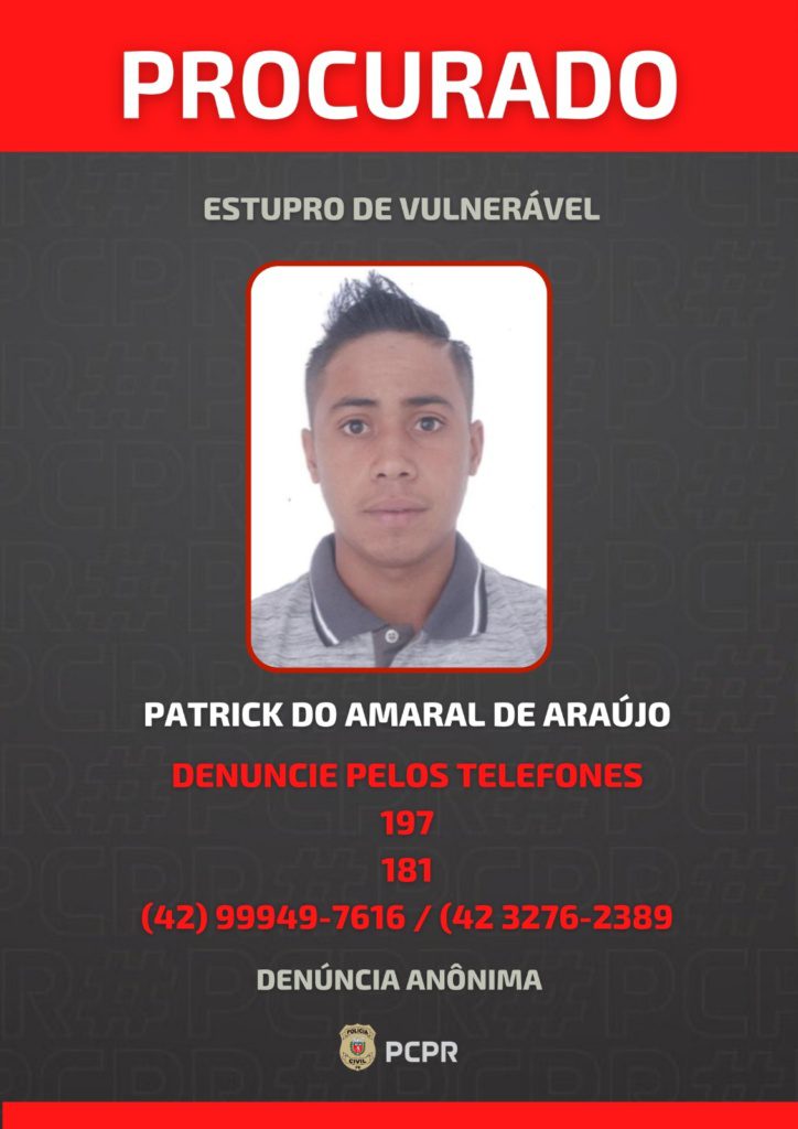 DENÚNCIAS – A PCPR solicita a colaboração da população com informações que auxiliem na localização do procurado. As denúncias podem ser feitas de forma anônima, pelos números 197, da PCPR, 181 do Disque-Denúncia ou 42 99949-7616 / 42 3276-2389, diretamente à equipe de investigação.