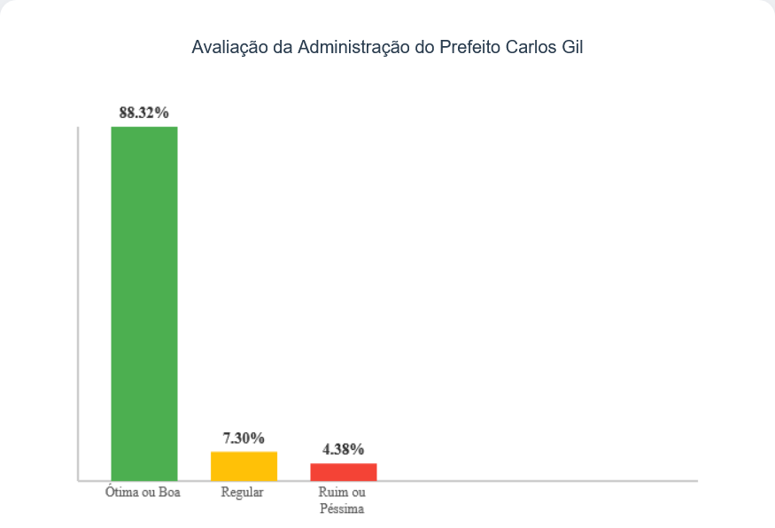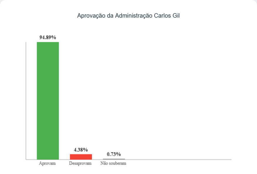 Ao serem questionados sobre a aprovação ou desaprovação da administração Carlos Gil, um expressivo percentual de 94,89% dos entrevistados aprovou a gestão. Apenas 4,38% desaprovaram, e 0,73% não souberam responder.