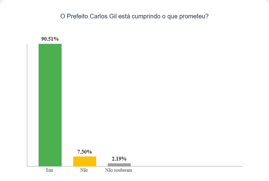 A credibilidade do prefeito Carlos Gil também foi um ponto de destaque no levantamento. Quando perguntados se o prefeito está cumprindo o que prometeu, a grande maioria, 90,51% dos entrevistados, respondeu “sim”. Apenas 7,30% disseram “não”, e 2,19% não souberam responder.