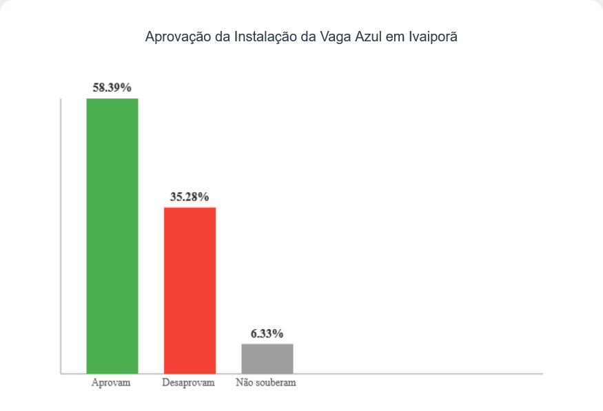 O levantamento da Global Inteligência Pesquisa também abordou a Vaga Azul, sistema de estacionamento rotativo implementado há apenas 15 dias em Ivaiporã, levando em conta o dia da entrevista (12/07). Apesar do curto período de funcionamento, a iniciativa já conta com a aprovação da maioria: 58,39% da população aprova a instalação do sistema, enquanto 35,28% desaprovam e 6,33% não souberam opinar.