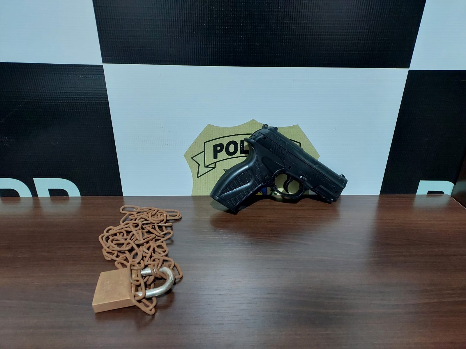 Durante as diligências, os policiais localizaram e apreenderam uma arma de pressão a gás, marca C11 CO2 Pistol e uma corrente de ferro. Segundo denúncias, o morador do local teria efetuado disparos com contra vizinhos além de utilizar a corrente para praticar ameaças.