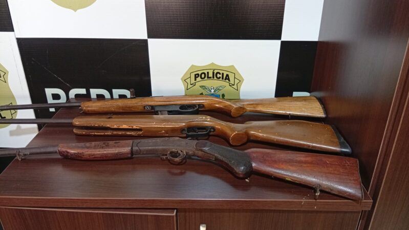 A ação foi motivada por denúncias de moradores da região, que relataram disparos de arma de fogo nas proximidades. Durante as diligências, constatou-se que no mesmo terreno havia duas residências. Em uma delas, ao ser questionado sobre a existência de armas, o morador negou a posse. Contudo, após buscas no interior da casa, foram localizadas três espingardas: uma de calibre .32, sem marca aparente, com número de série 16301; uma espingarda calibre .22, marca URKD, nº 6800; e uma espingarda de pressão, marca CBC, com numeração suprimida por ferrugem. As armas estavam escondidas atrás de um guarda-roupas, no quarto do morador.