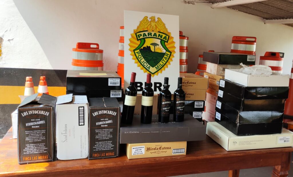 A Polícia Rodoviária Estadual (PRE) apreendeu 136 garrafas de vinhos sem nota fiscal em Lidianópolis, no Paraná, na terça-feira (19). A mercadoria estava sendo transportada em um veículo Fiat Siena, com placas de Pirai do Sul.