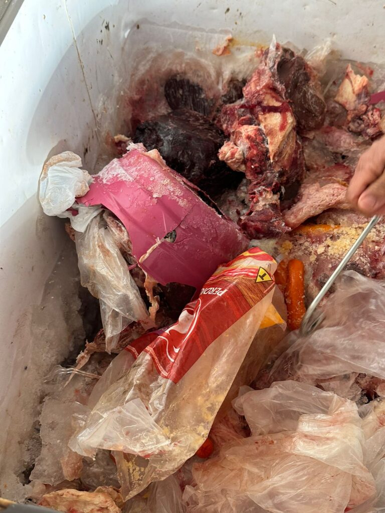 Foi constata a existência de carnes mantidas em condições impróprias, que não passarão por inspeção sanitária; acondicionadas em contato direto com o gelo, sem proteção; com coloração fora do padrão e procedência duvidosa;