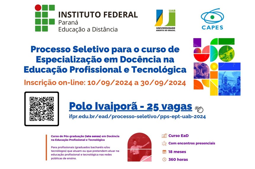 O Polo UAB de Ivaiporã (Universidade Aberta do Brasil), em parceria com o IFPR, oferece 25 vagas para a especialização em Docência na Educação Profissional e Tecnológica. As inscrições já estão abertas