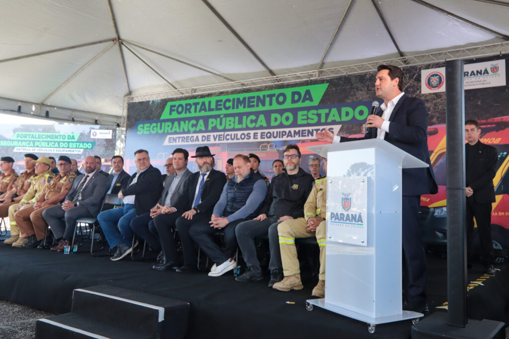 O Governo do Estado realizou, nesta segunda-feira, dia 3 de junho, uma cerimônia de entrega de veículos, embarcação militar e equipamentos de proteção individual na Academia da Polícia Militar do Guatupê, em São José dos Pinhais, por intermédio da Secretaria de Estado da Segurança Pública. São caminhões, ambulâncias, viaturas e equipamentos que serão usados nas ações de prevenção e de atendimento da corporação.