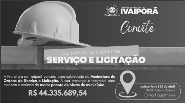 A Prefeitura de Ivaiporã, sob administração do prefeito Carlos Gil e Marcelo Reis, tem o prazer de convidar a população para a solenidade de Assinatura de Ordens de Serviço e Licitação, que marcará o anúncio do maior pacote de obras já realizado no município. O evento acontecerá na quinta-feira, 25 de abril, às 19h00, no Centro Cultural Olívia Hauptmann.
