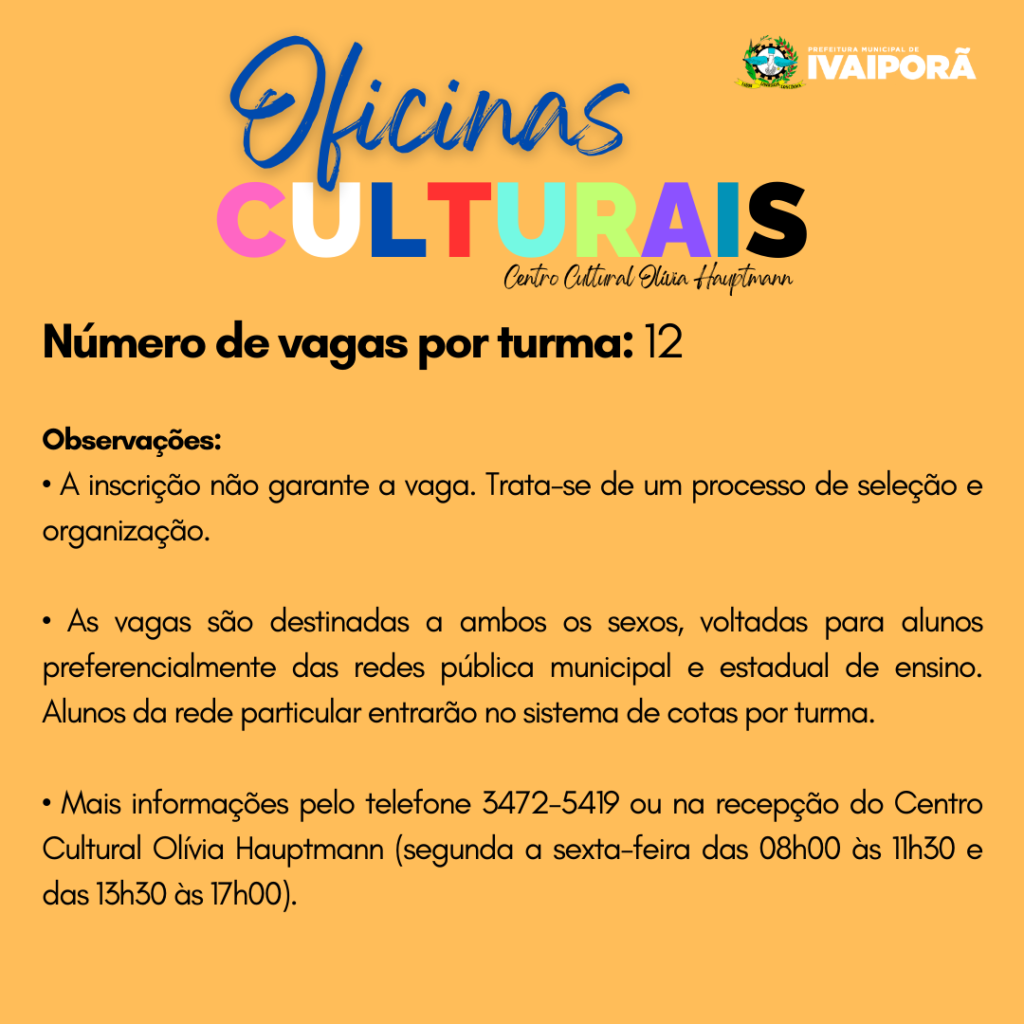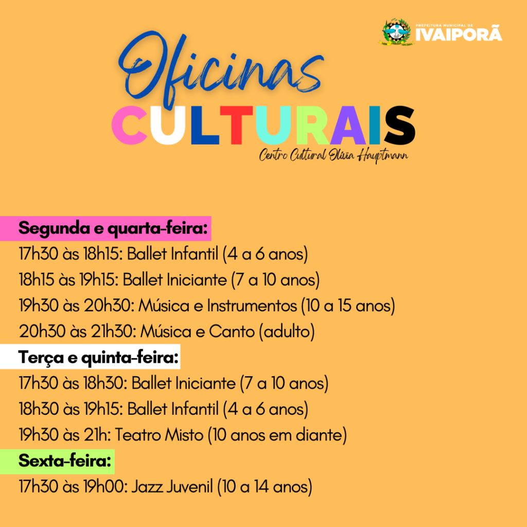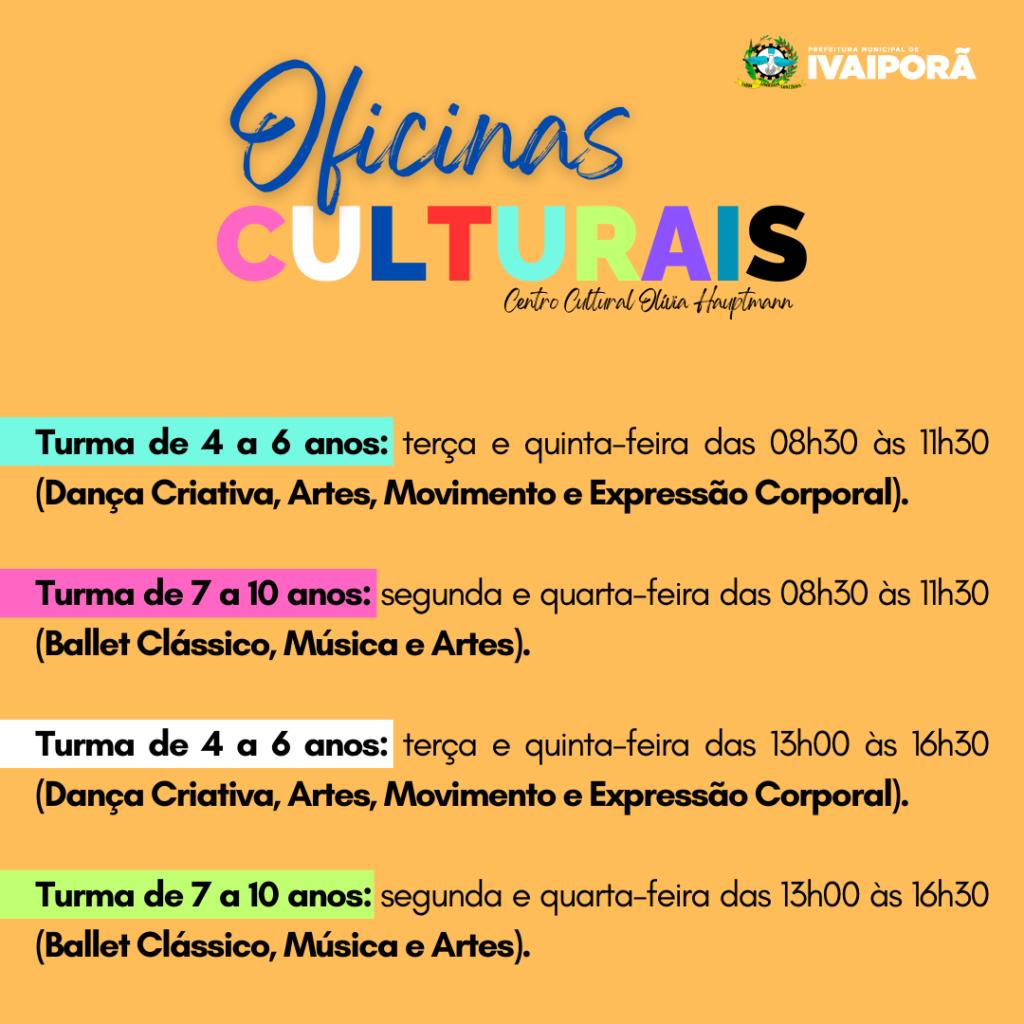 Entre os dias 15 e 26 de abril, a Prefeitura de Ivaiporã está com inscrições abertas para Oficinas Culturais, por intermédio da Secretaria Municipal de Cultura, proporcionando uma variedade de oportunidades para quem busca se expressar artisticamente e desenvolver habilidades criativas. Sob a supervisão do secretário municipal de Cultura, Dionata Rodrigues, as Oficinas Culturais oferecem aulas de dança, música, artes plásticas, visuais e teatro.