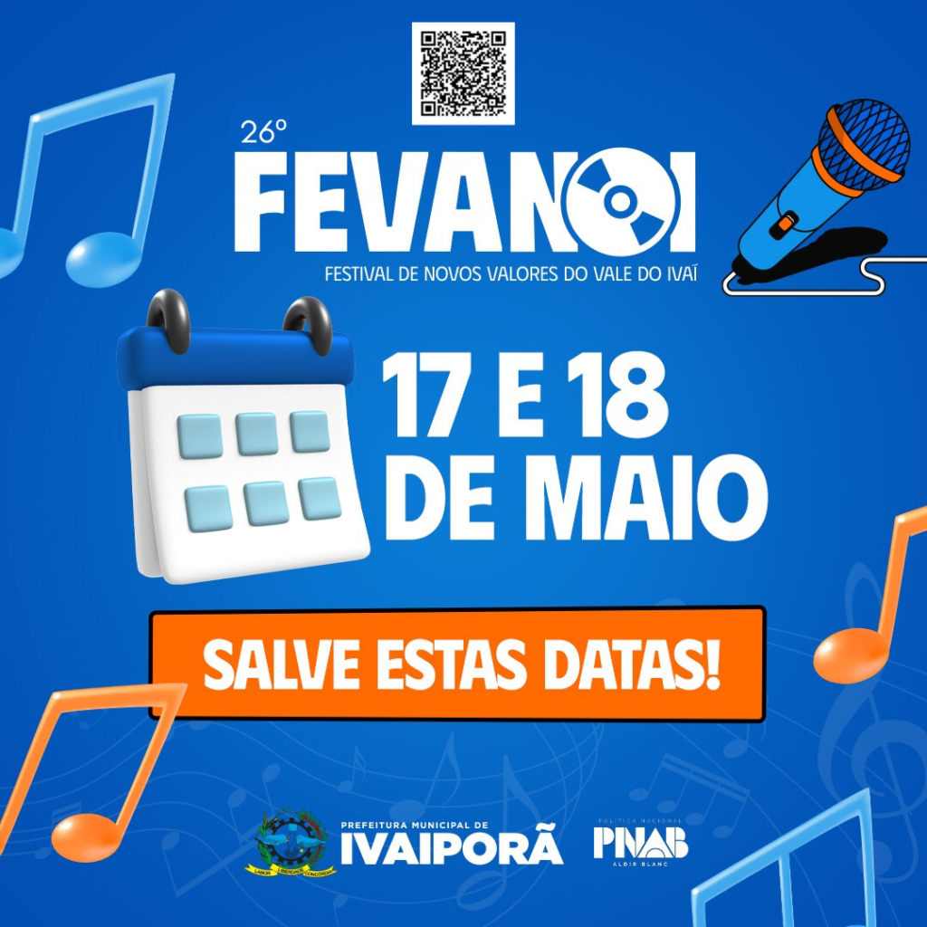 A cidade de Ivaiporã se prepara para o 26º Fevanoi (Festival de NovosValores do Vale do Ivaí), que será realizado no Centro Cultural Olívia Hauptamann nos dias 17 e 18 de maio às 19h00. Organizado pela Prefeitura, por meio da Secretaria Municipal de Cultura, o Fevanoi éuma oportunidade para valorizar a música e promover o talento regional.