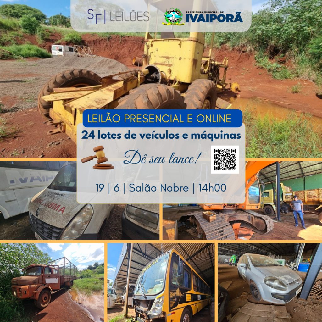 A Prefeitura de Ivaiporã anunciou a realização de um leilão público para a alienação de veículos e máquinas pertencentes ao município, no dia 19 de junho, a partir das 14h00, no Salão Nobre da Prefeitura e também online no portal SF Leilões – www.sfleiloes.com.br.