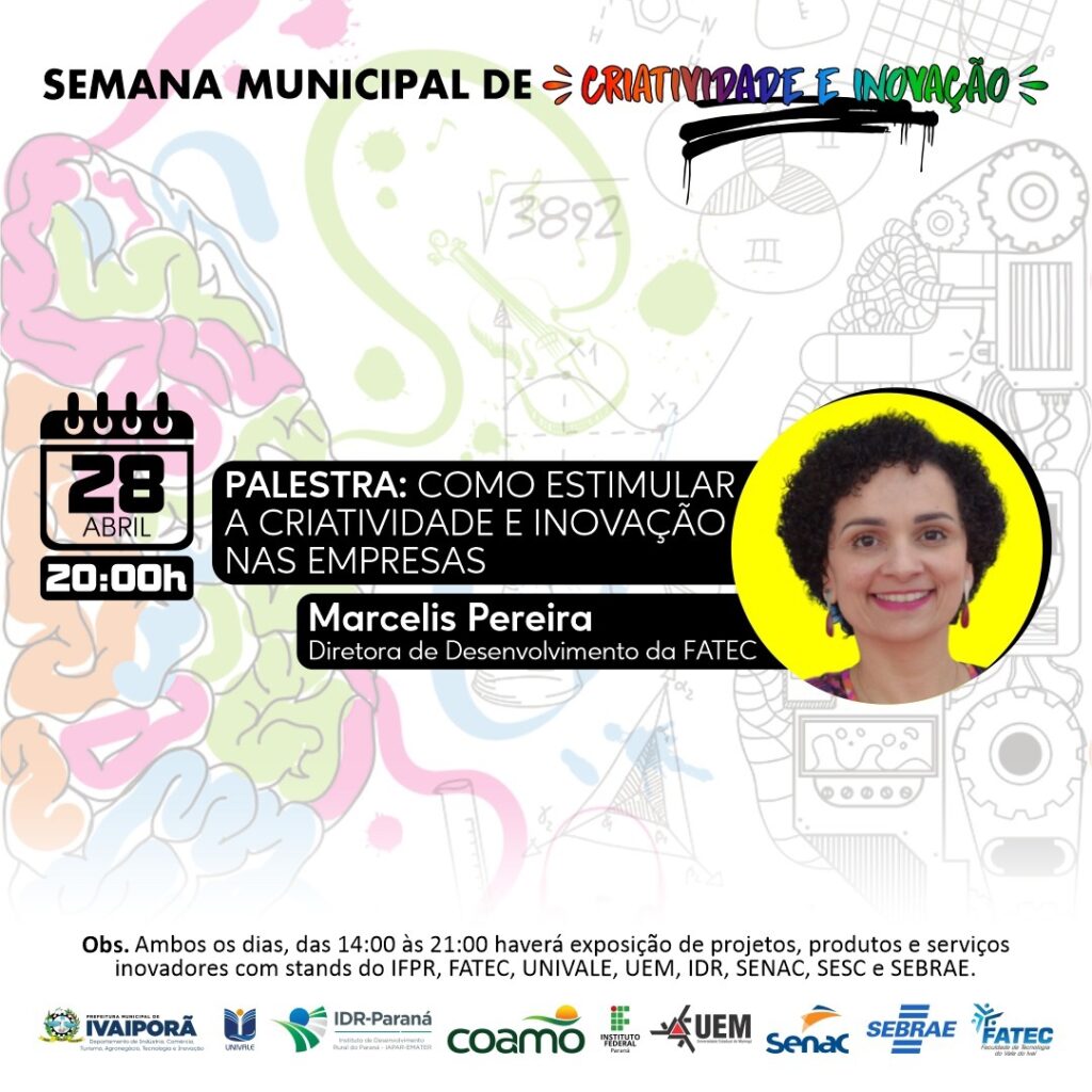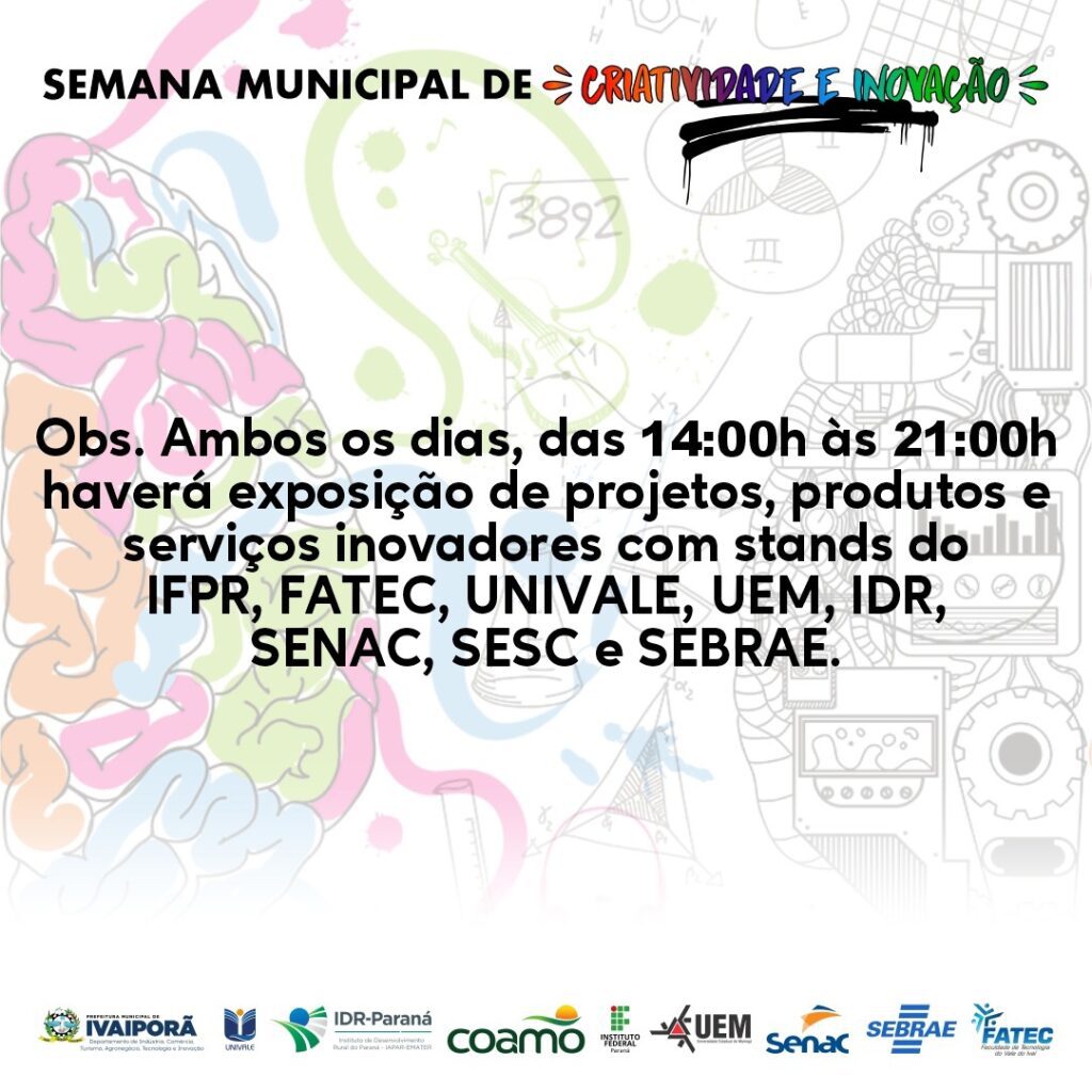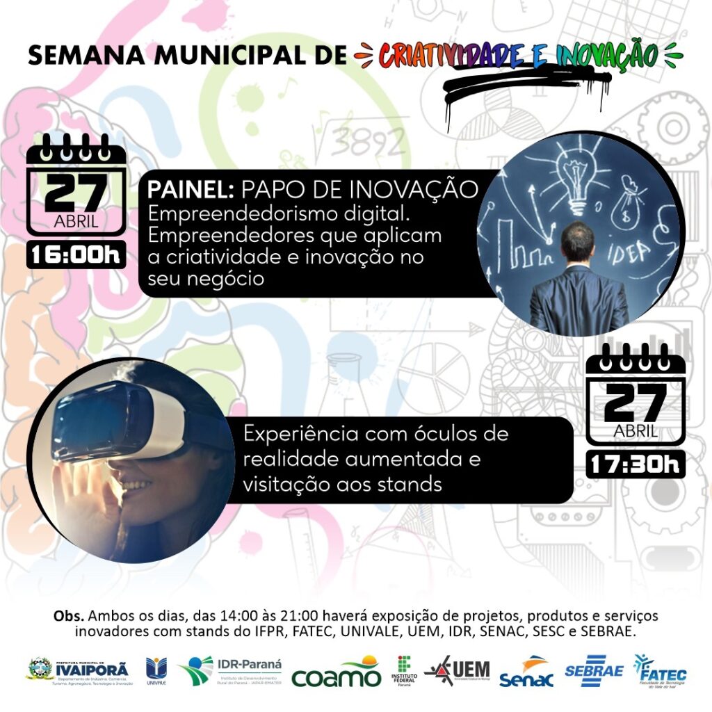 O Departamento de Tecnologia e Inovação da Prefeitura de Ivaiporã realizará a Semana Municipal de Inovação no Centro Cultural Olívia Hauptmann, na quinta e sexta-feira, dias 27 e 28 de abril, entre as 14h00 e 20h00, quando haverá exposição de projetos, produtos e serviços inovadores com stands do IFPR, Fatec, Univale, UEM, IDR, Senac, Sesc e Sebrae.